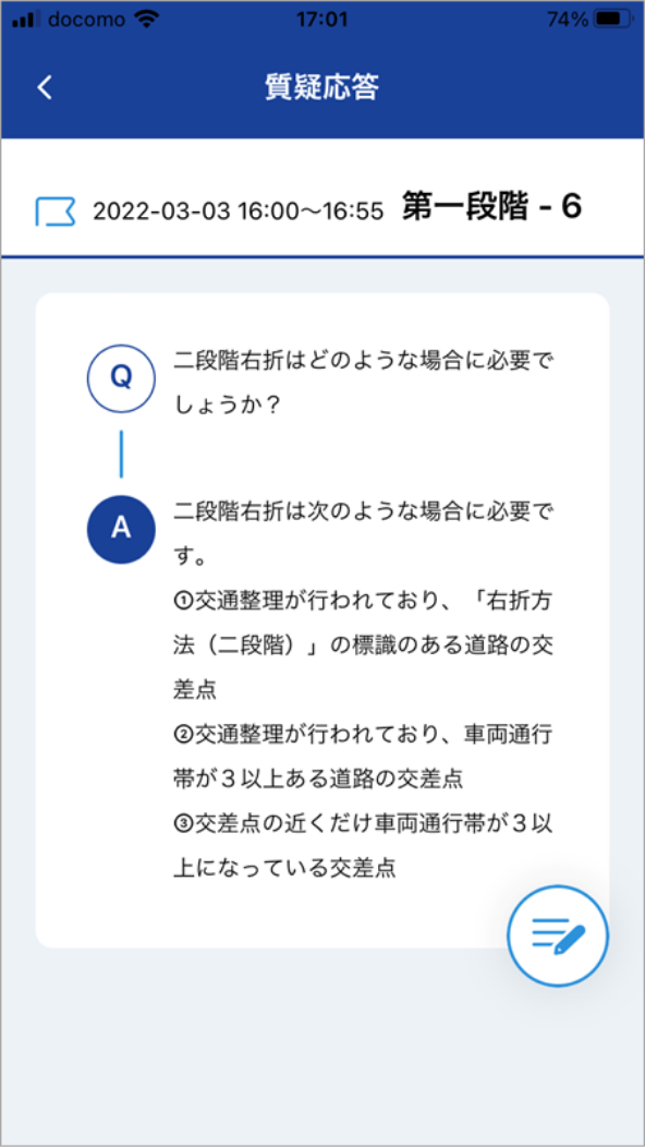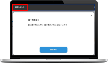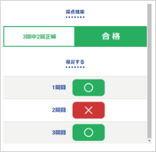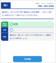 オンデマンド受講終了後、教習の理解度を確かめるための問題が出題されます。合格するまで何度もチャレンジしてみましょう!理解度チェックは、対象の学科の受講が済んでいればいつでも解きなおすことができます。