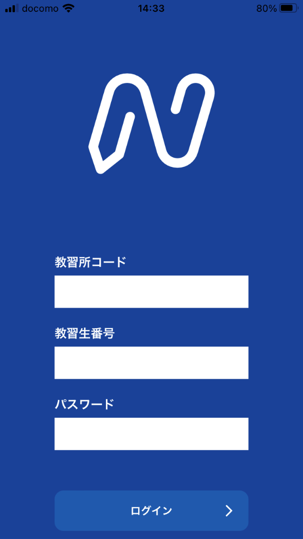 - アプリを起動させ、教習所コード・教習生番号・パスワード(西暦を含めた誕生日8ケタ)を入力してログインします。