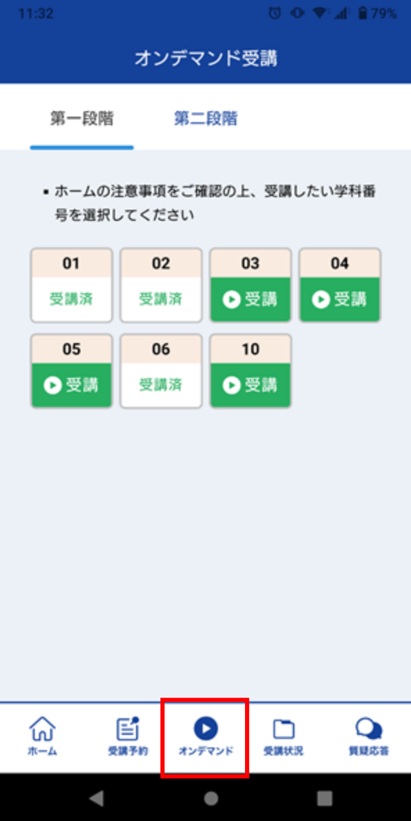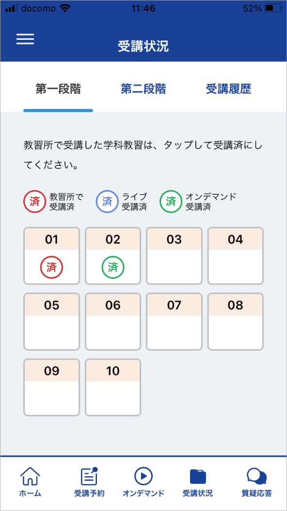 - オンデマンド教習で受講が完了した教習は緑色の「済」マークが自動で付きます。