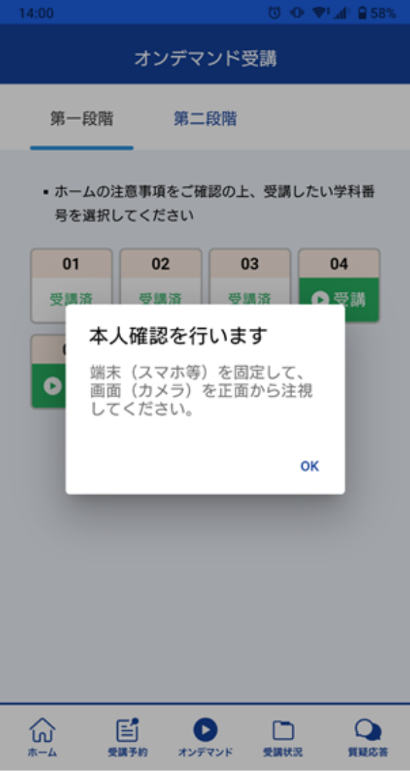 - 本人確認の認証後、受講可能な状態となります。 受講するボタンをタップします。